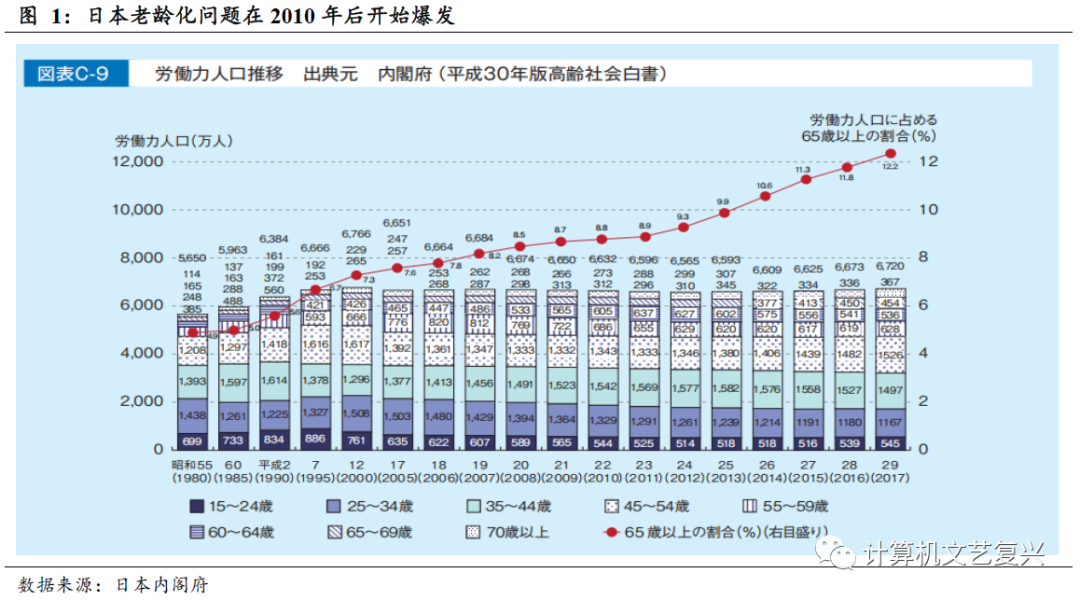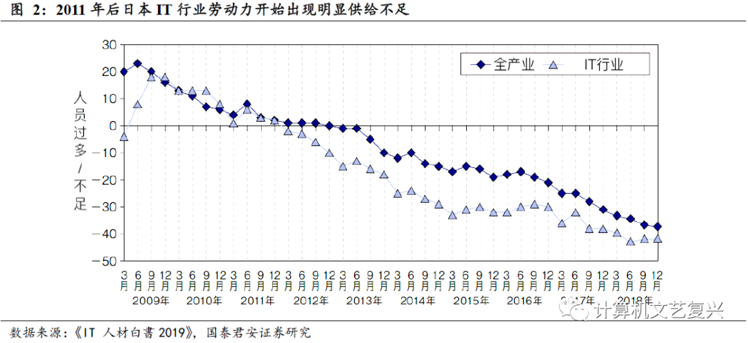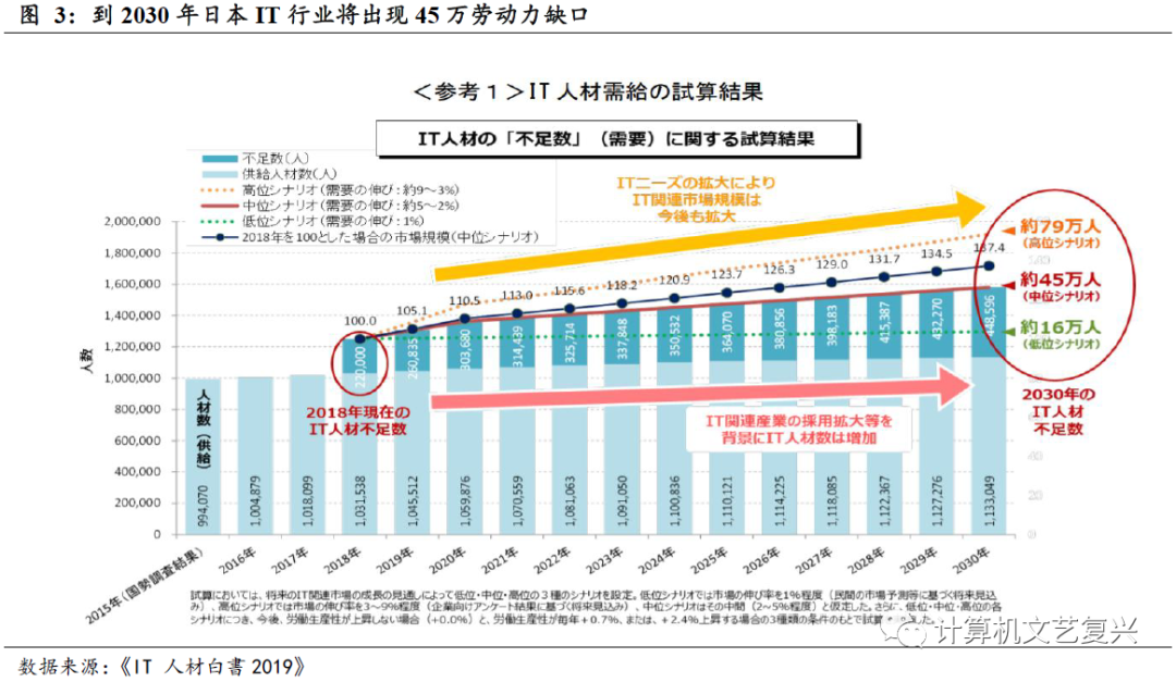 但老齡化程度不斷提升,外包人員缺口不斷放大,或?qū)⑨尫徘|級市場。日本人口老齡化是一個(gè)漫長的故事,但真正發(fā)揮作用是在2010年前后。到2010年,日本老齡化問題開始凸顯,面對本土程序員的接連退休,IT人員供需缺口不斷放大,可以明顯看到2011年后65歲以上老人占比開始急劇上升。日本勞動省數(shù)據(jù)顯示,到2019年IT人員缺口將達(dá)到28.8萬人,按照35萬人民幣/人/年的單價(jià)計(jì)算,其規(guī)模超千億元,并且還在不斷放大。預(yù)計(jì)到2030年,IT人員缺口規(guī)?;虺^45萬人,預(yù)計(jì)將釋放超1500億人民幣的市場空間。