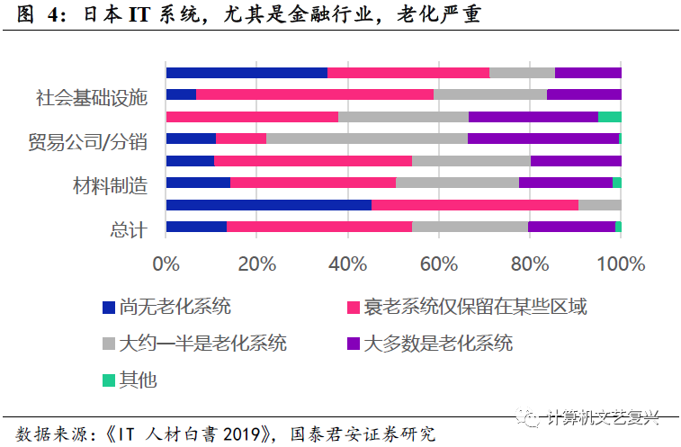 拖延能夠應(yīng)付短時(shí)間的勞動力供給不足,但終究不是長久之計(jì)。雖說到2019年理論上的人員缺口釋放的IT外包市場規(guī)模已經(jīng)突破千億,然而真正釋放的市場規(guī)模還很小,國內(nèi)目前知名對日外包企業(yè)尚未有出現(xiàn)超過10億收入體量的案例。我們判斷,其主要原因是日本企業(yè)在發(fā)現(xiàn)勞動力供給不足后選擇將本該進(jìn)行的IT項(xiàng)目延期,繼續(xù)使用本就該更換的硬件或系統(tǒng)。我們認(rèn)為,這樣的做法確實(shí)在短期內(nèi)壓制了離岸外包需求的釋放,但是終究不是長久之計(jì)。
