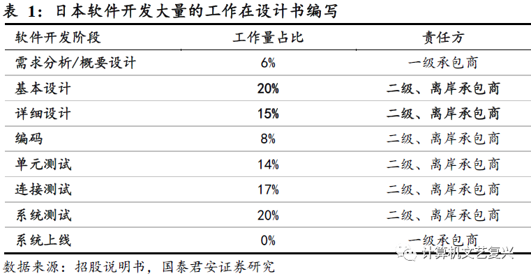 日本的軟件開發(fā)采用頂層設(shè)計(jì)思路,其中最大的工作量在于設(shè)計(jì)書編寫。設(shè)計(jì)書的編寫在日本定制軟件開發(fā)工程中是最為重要的步驟,日本人習(xí)慣在寫代碼之前,要有詳細(xì)的設(shè)計(jì)書,而根據(jù)設(shè)計(jì)書復(fù)刻代碼,是一件很容易的事。根據(jù)公司招股書數(shù)據(jù),公司在軟件開發(fā)執(zhí)行過程中,大部分工作量主要花費(fèi)在設(shè)計(jì)書的編寫上。例如,公司開發(fā)的“投資顧問平臺去FLASH化對應(yīng)”項(xiàng)目,其2018年10月的納品書明確記載了開發(fā)成果的種類、數(shù)量,包括基本設(shè)計(jì)書(1380頁)、詳細(xì)設(shè)計(jì)書(1130頁)、代碼(1800Step)、測試用例書(280頁)等。