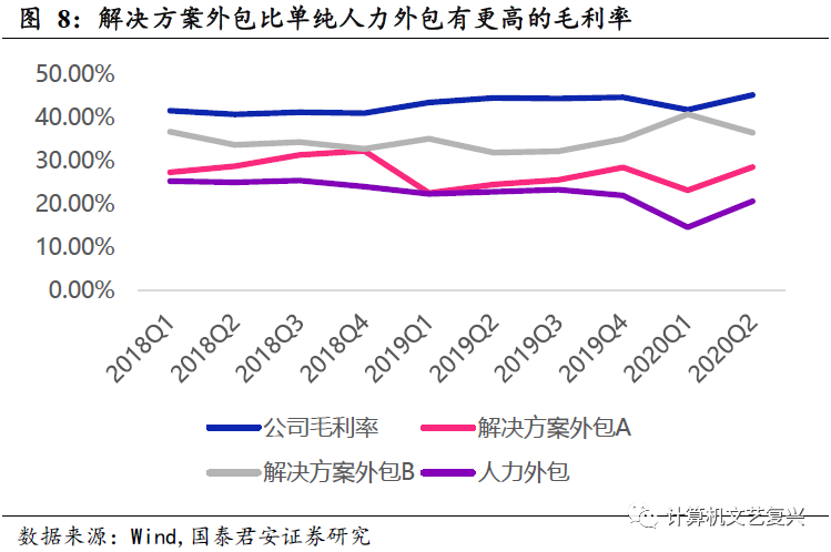 名為外包,實(shí)則解決方案輸出。我們在10月22日發(fā)布的的報(bào)告《軟件服務(wù)也可以是一門好生意》中詳細(xì)闡述了三種外包模式(人力外包、單環(huán)節(jié)外包、解決方案外包)的區(qū)別。單純?nèi)肆ν獍桓兜膬H僅是人頭,客戶檢查的是所購買勞動力的考勤記錄。而解決方案外包,軟件服務(wù)公司交付的是系統(tǒng)而非勞動力,只不過這個(gè)系統(tǒng)的定價(jià)是由社會平均勞動量決定的。在這種情況下,軟件服務(wù)公司若能高效完成任務(wù),其實(shí)不需要投入合同中規(guī)定的人力,因此有效率提升的可能。因此大多數(shù)的解決方案外包毛利率是要高于單純?nèi)肆ν獍模壳皝砜?,凌志基本所有的?xiàng)目,都是解決方案外包。