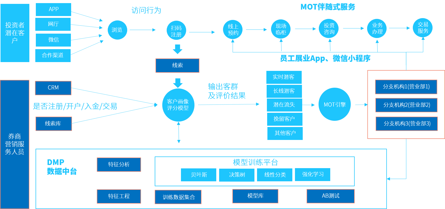數(shù)字化轉(zhuǎn)型趨勢(shì)下,基于凌志DMP客戶畫(huà)像產(chǎn)品和MOT引擎產(chǎn)品,配套CRM潛客池和員工展業(yè)App+微信小程序,提供線上線下相結(jié)合的場(chǎng)景化伴隨式服務(wù),幫助券商實(shí)現(xiàn)客戶細(xì)分和價(jià)值挖掘。