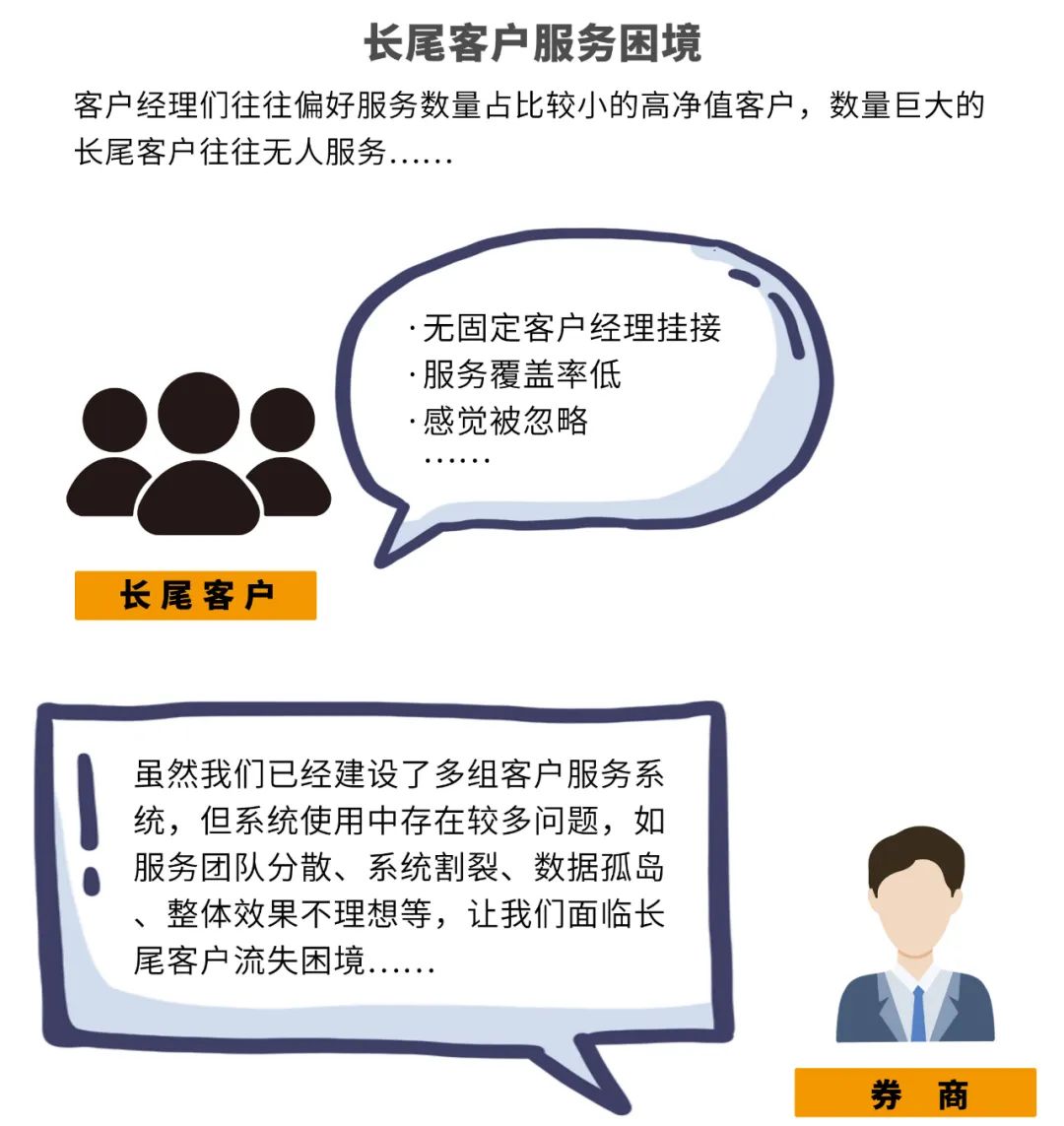 金融科技的應(yīng)用發(fā)展,推動(dòng)證券行業(yè)獲客渠道向線上轉(zhuǎn)變,客戶增加呈跨越式增長。與此同時(shí),數(shù)量巨大的客戶與券商有限的服務(wù)資源產(chǎn)生的矛盾愈演愈烈,導(dǎo)致大量的長尾客戶(中小客戶)缺乏優(yōu)質(zhì)服務(wù)。