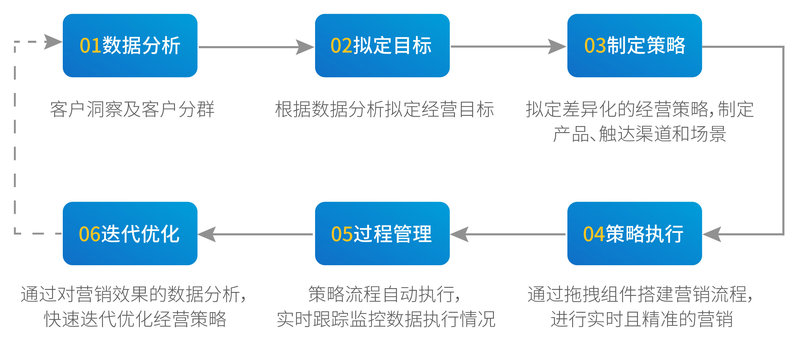 從識(shí)別客戶的相關(guān)標(biāo)簽和行為數(shù)據(jù)到對(duì)客戶的畫像分群,針對(duì)客群制定個(gè)性化的服務(wù)策略、配置渠道與內(nèi)容,在客戶關(guān)鍵場(chǎng)景下進(jìn)行線上或線下的運(yùn)營觸達(dá)。